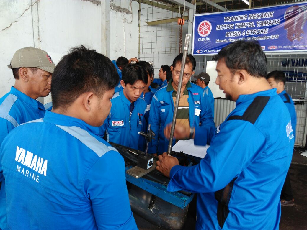 Saat ini sedang dilaksanakan training mekanik untuk mesin-mesin 4 Tak di wilayah MANADO. Program pelatihan yang dilakukan oleh PT Karya Bahari Abadi selaku distributor resmi motor tempel Yamaha ini diikuti oleh 15 peserta yang sebagian besar merupakan staf teknis yang bertugas di berbagai macam instansi antara lain, Polisi Perairan dan Udara, PT. ANTAM, PT. Jasa Teknik Sorowako, Bunaken Oasis, Siladen Resort dan Hasjrat Abadi.
